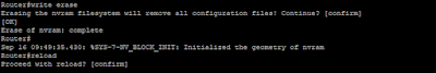 Namun dengan kita menggunakan “wr era” otomatis yang terhapus adalah file startup-config. Karena itu file startup-config akan terhapus dengan sendirinya. Karena file running-config masih ada, maka konfigurasi masih akan berjalan. Karena itu kita harus merestart sistem agar running-config berhenti berjalan.